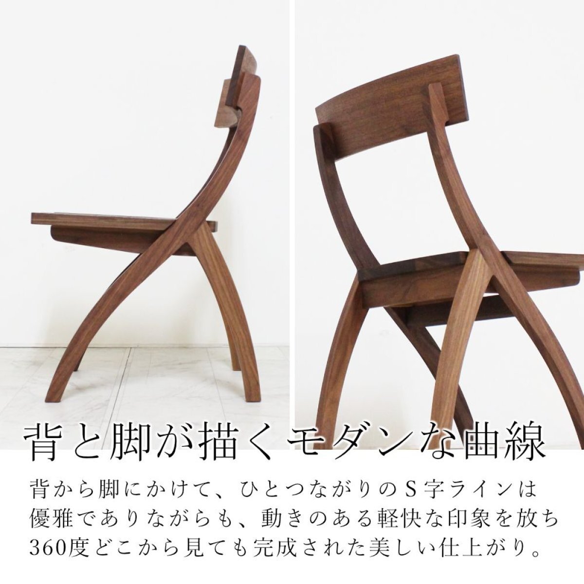 背もたれから脚にかけて、ひとつながりの美しいS字ラインが優雅でありながら、軽やかで動きのある印象を与えます。360度どこから見ても完成された美しい仕上がりです。