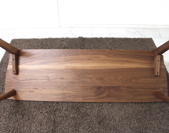 全体を支えるシンプルで癖のない脚。座面に施された彫り込みは肌あたりもよく、すらりと伸びるその姿は、曲木加工によって作られた背もたれと総無垢のフレームと合わせて、実に優雅です。座ると木の質感やぬくもりが背中全体に伝わってきます。長くお使いいただいた際の色味の変化なども楽しみの一つになる逸品です。