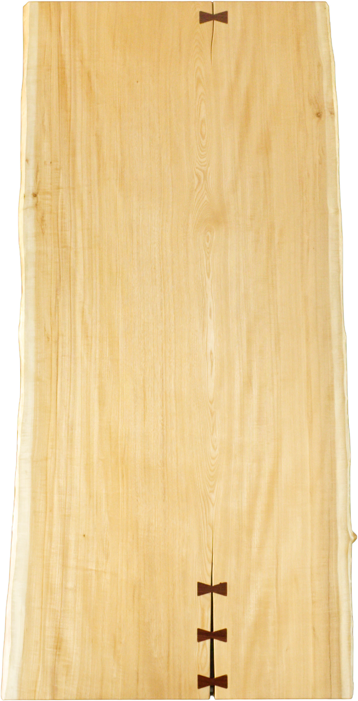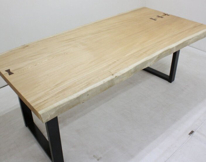 リボン型の所は、チギリと言って割れが広がらないようにする為のものです。これをあえて違う樹種を使うことで、お洒落に仕上げました。明るめの栓は杉やヒノキなどの床にも合わせやすく、ダイニングやフローリングのお部屋にぴったりです。