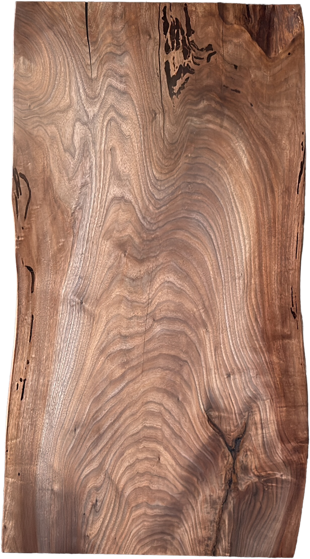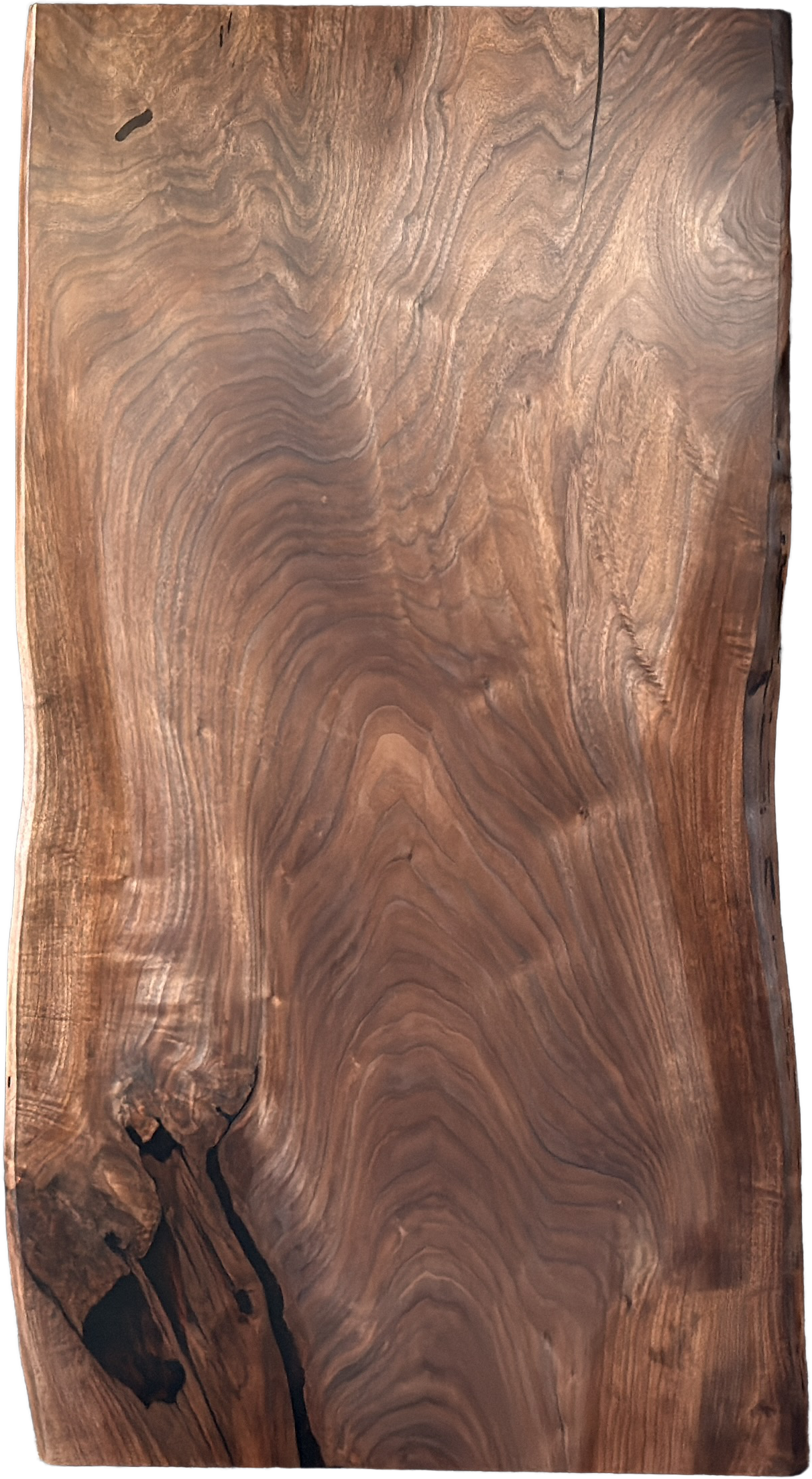 好きな人にはたまらない癖のあるウォールナットの一枚板です。天然木ならではの複雑な杢が特別感を演出します。多少の埋めはありますが、それを気にさせない存在感の一枚板です。