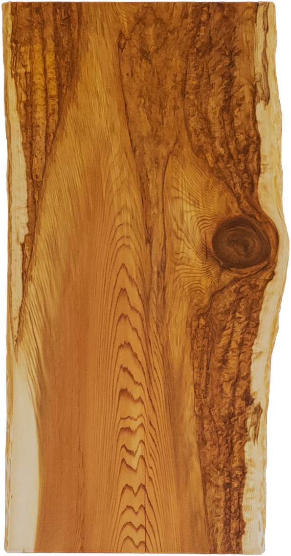 複雑な杢と特徴的な節が魅力の杉の一枚板。普通の杉にはない、天然木らしさを存分に味わえる、特別な一枚です。