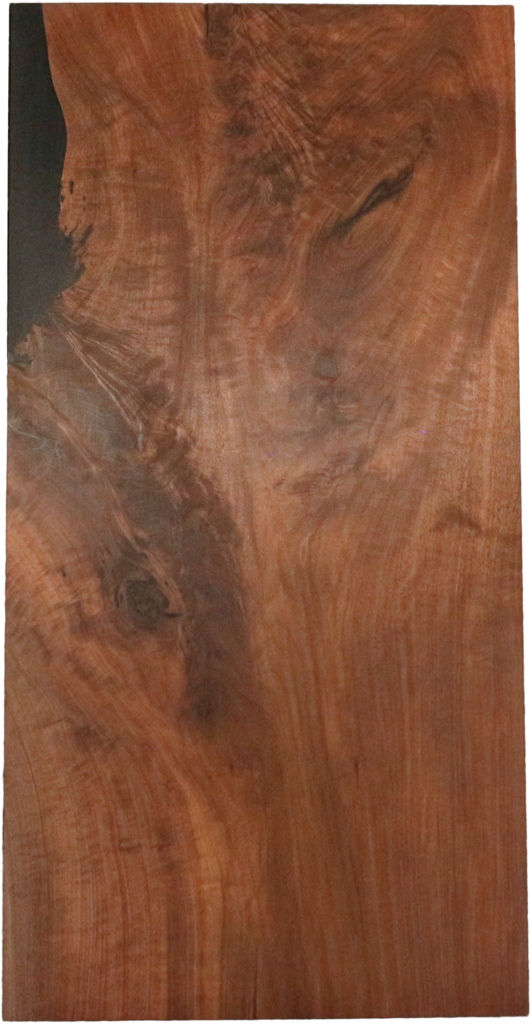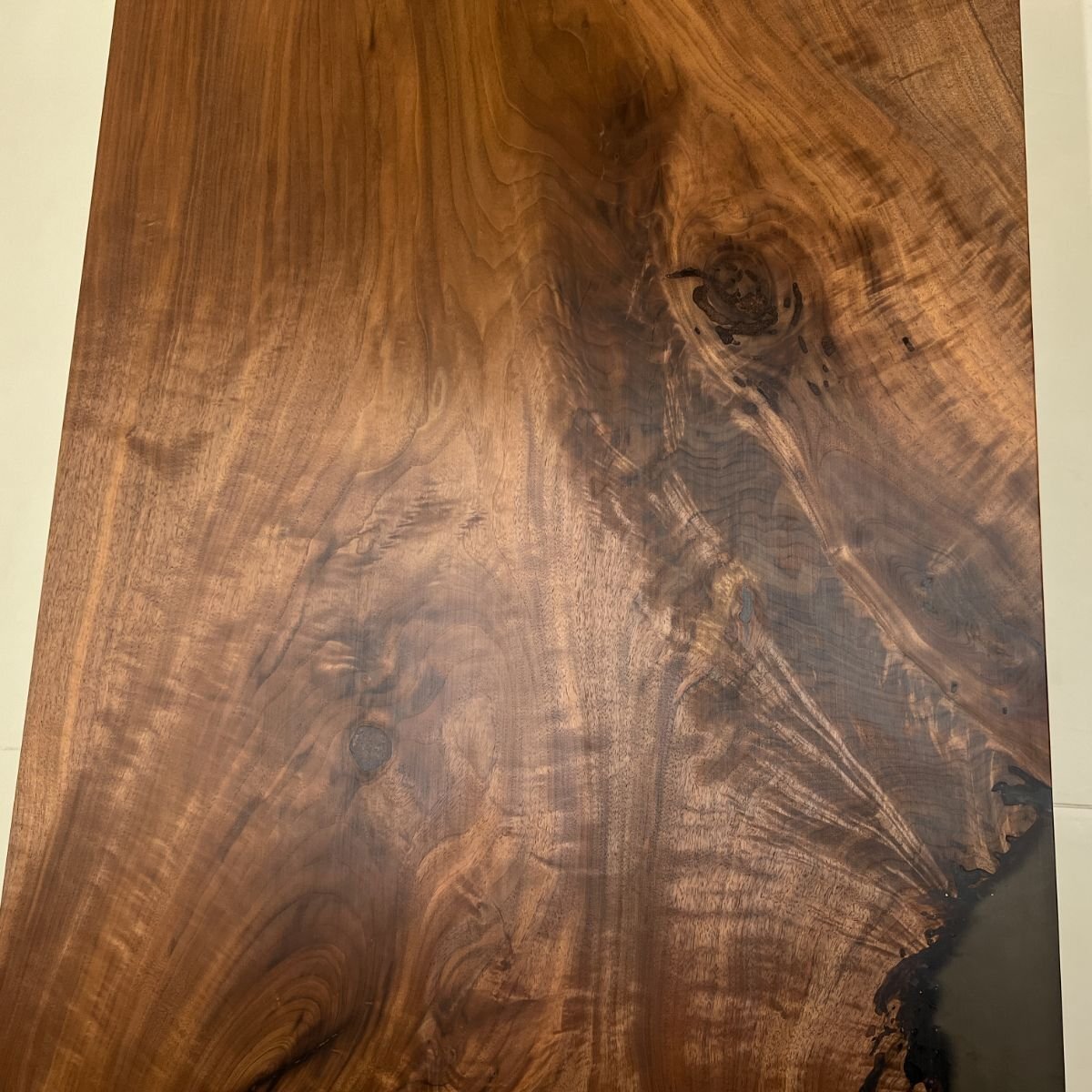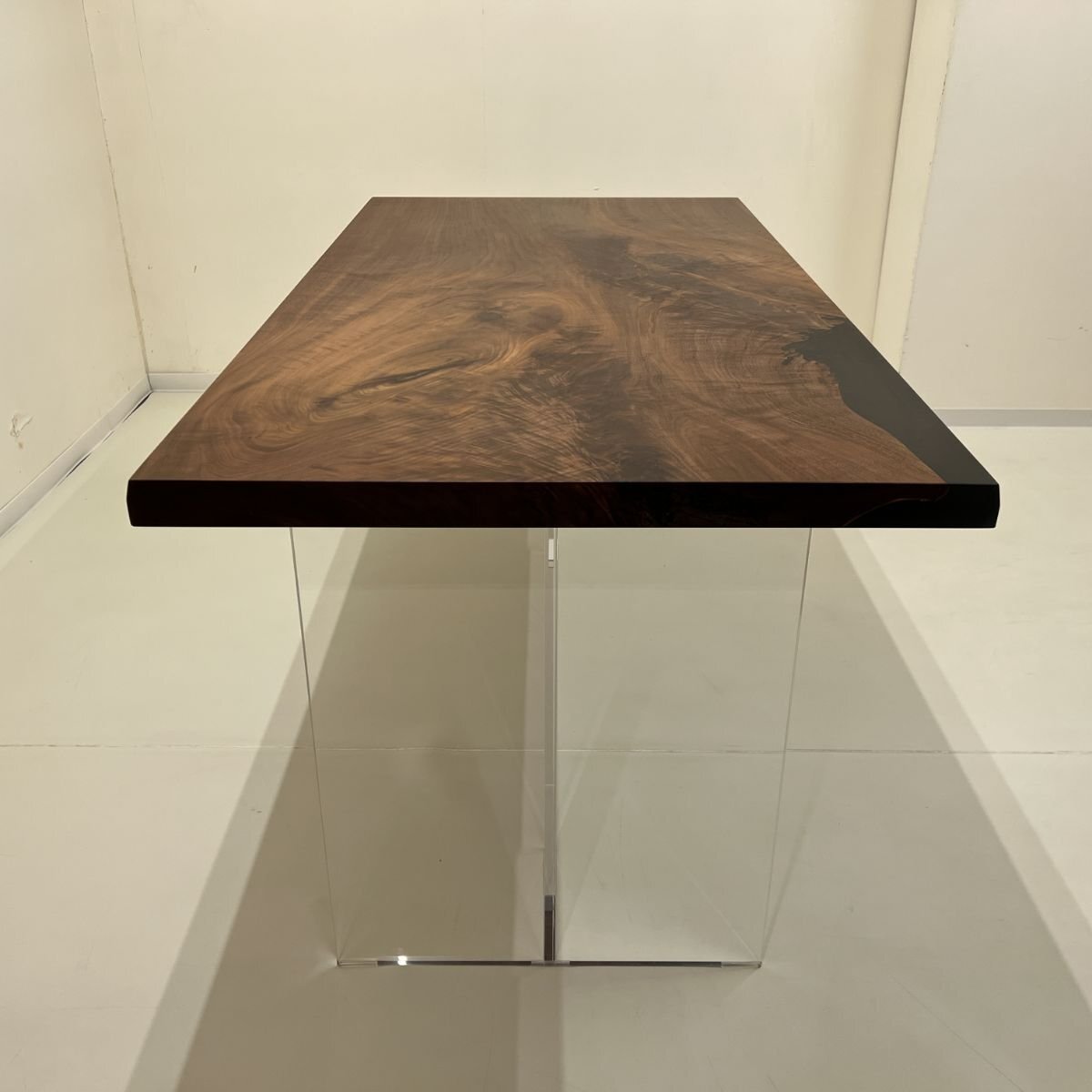 縮み杢やサバ杢が美しい、ウォールナット一枚板に、レジンを合わせることでモダンに仕上げました。ウォールナットに合わせて暗めのレジンを流し込み、使いやすい長方形にする事で、実用性も高く、普段使いにも出来る高級一枚板です。