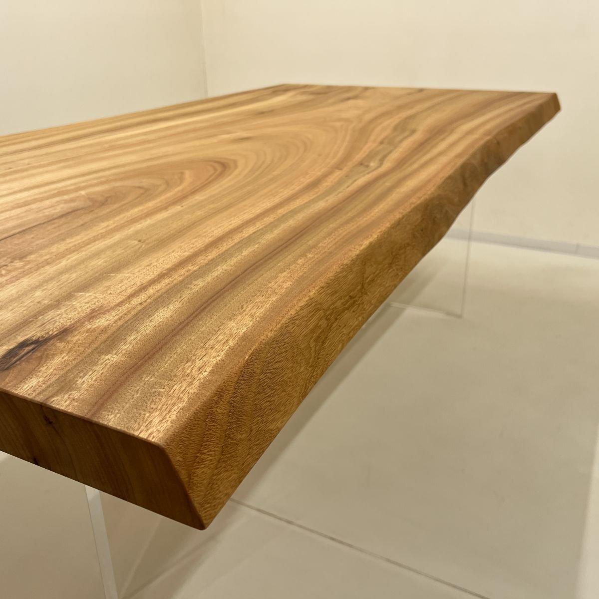 川の流れのような美しい模様が魅力的で、優しい風合いと爽やかな香りに癒される楠(クス)の一枚板です。縮み杢の輝きがアクセントとなり、高級感も引き立てます。