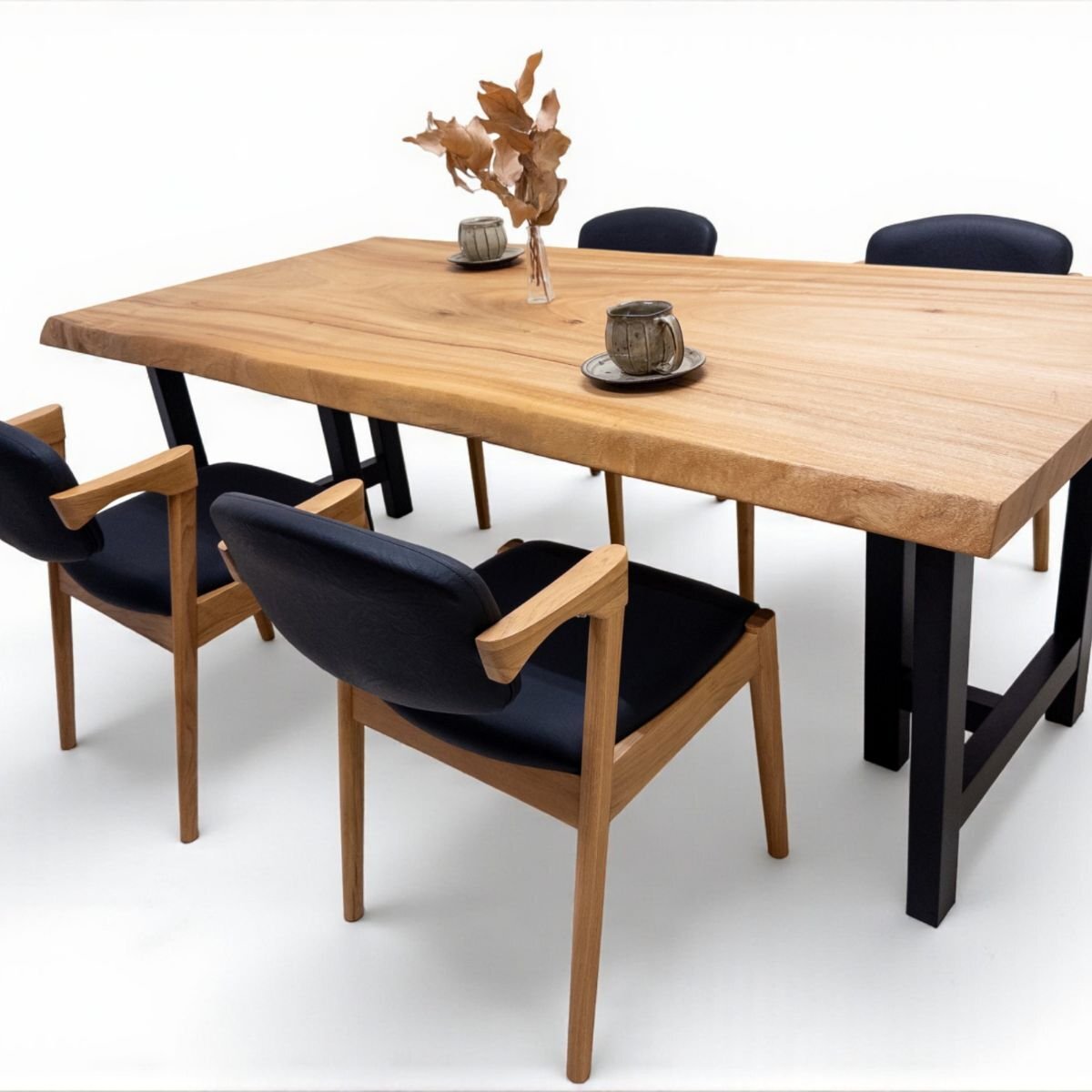 控えめな色合いが優しさを感じさせる楠(クス)の一枚板。縮杢など上質な杢も兼ね備えて、高級感も演出します。空間に調和する優しい風合いや、さわやかな香りが魅力。6人掛けも対応できる余裕のサイズで、ゆったりとご使用いただけます。